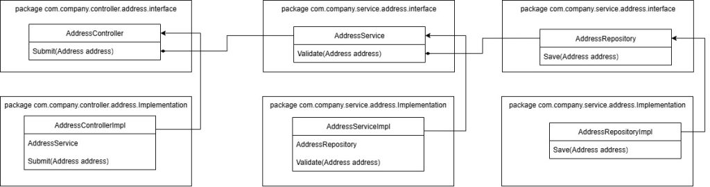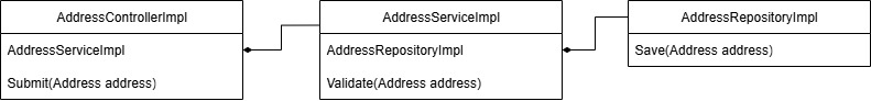 In the below diagram, we have three tightly-coupled layers: AddressControllerImpl, AddressServiceImpl, and AddressRepositoryImpl. The flow is simple — the controller calls the service, the service calls the repository, and finally the repository saves the address.