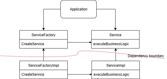 Note: the service factory implementation depending on the service implementation. That is fine because bit is isolated from the system and nobody now will access the service implementation directly and it is refrenced in one concrete component (serviceFactory).